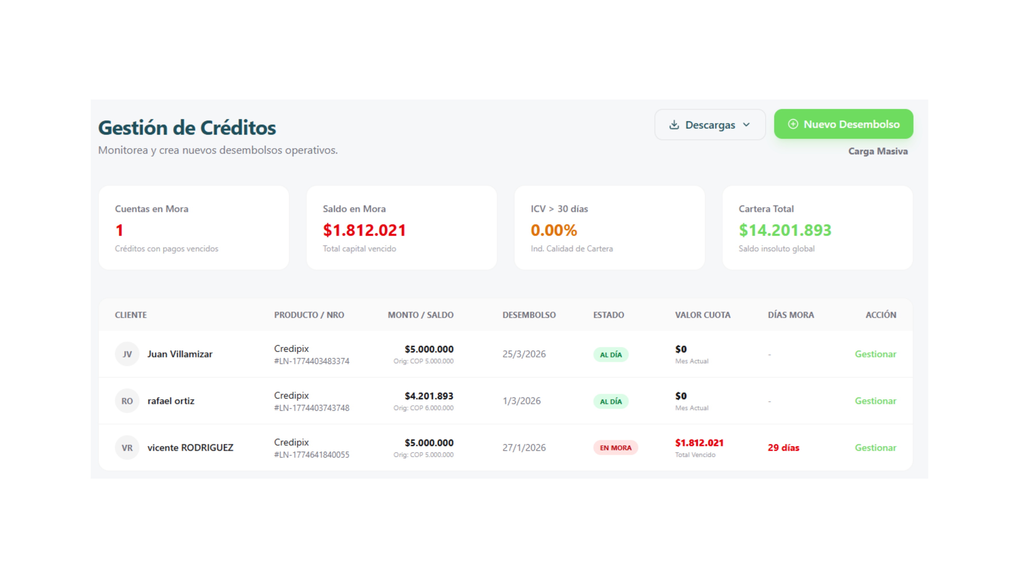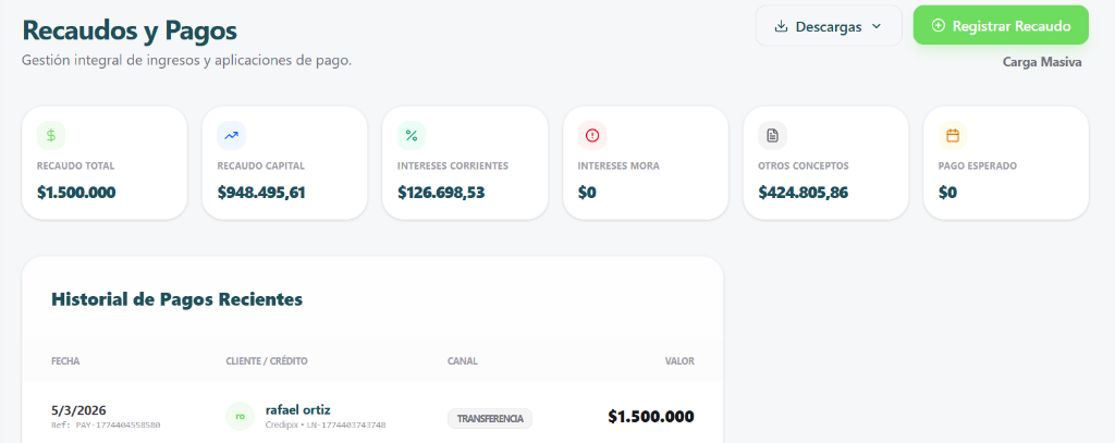 Desde el registro del crédito hasta el cobro automático. Una sola plataforma.